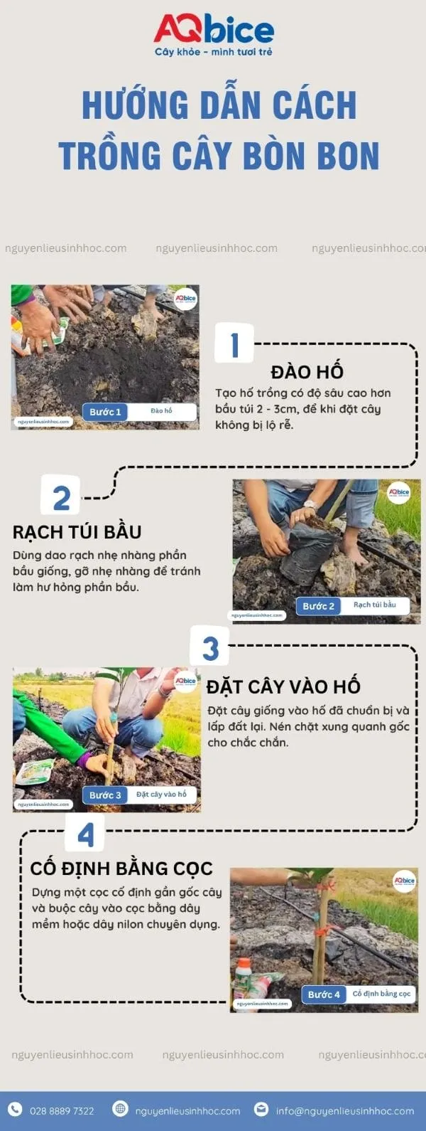 Sau khi hoàn tất khâu chuẩn bị, tiến hành cách trồng cây bòn bon theo quy trình chuẩn. Việc này đảm bảo cây bén rễ nhanh và sinh trưởng ổn định.