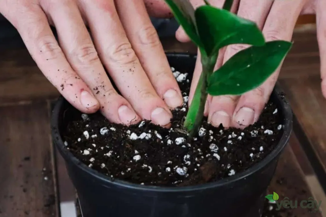Đổ từ từ giá thể đã chuẩn bị vào xung quanh bộ rễ của cây. Dùng tay hoặc xẻng nhỏ vun đất đều, lấp kín tất cả các khoảng trống bên trong chậu. Khi đổ đất, hãy nhẹ nhàng lắc nhẹ chậu để đất lấp đầy các khe hở.