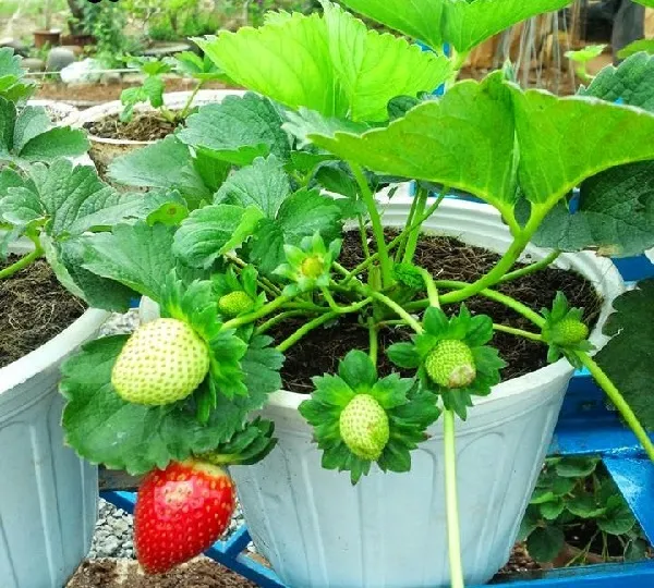 Những chậu dâu tây với lá xanh tươi và những bông hoa trắng tinh khôi là điểm nhấn tuyệt đẹp cho không gian sống. Hoạt động chăm sóc cây cảnh giúp giải tỏa căng thẳng hiệu quả. Đây là một trải nghiệm thư giãn, nuôi dưỡng tâm hồn sau những giờ làm việc mệt mỏi.