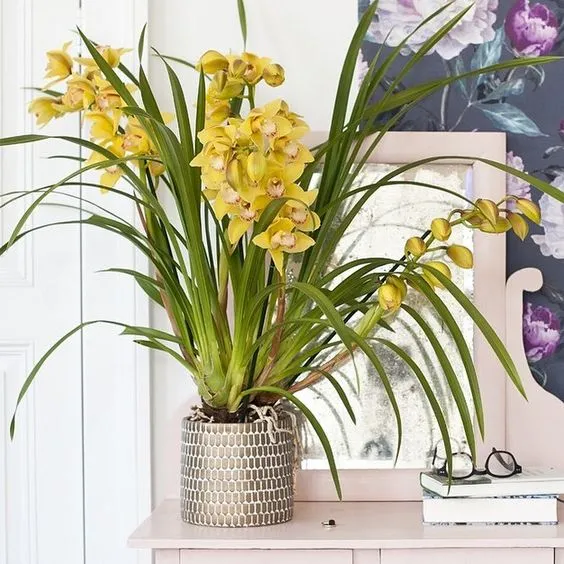 Chậu trồng Địa Lan Santo nên là chậu đất nung hoặc chậu sứ có lỗ thoát nước lớn ở đáy. Chậu nên có đường kính đủ lớn và dáng cao để cung cấp không gian cho bộ rễ phát triển. Điều này cũng giúp cành hoa rủ dài tự nhiên, tạo vẻ đẹp thanh thoát.