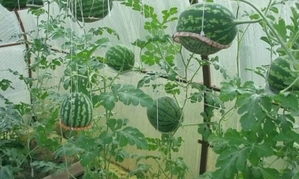 Nếu không gian hạn chế, hãy trồng dưa hấu leo giàn. Dùng cọc tre hoặc khung kim loại cao khoảng 2 mét. Đặt gần gốc cây. Dùng dây buộc nhẹ nhàng các nhành dưa hấu lên giàn. Giàn leo giúp tiết kiệm diện tích. Nó cũng giúp quả nhận được ánh sáng đều.