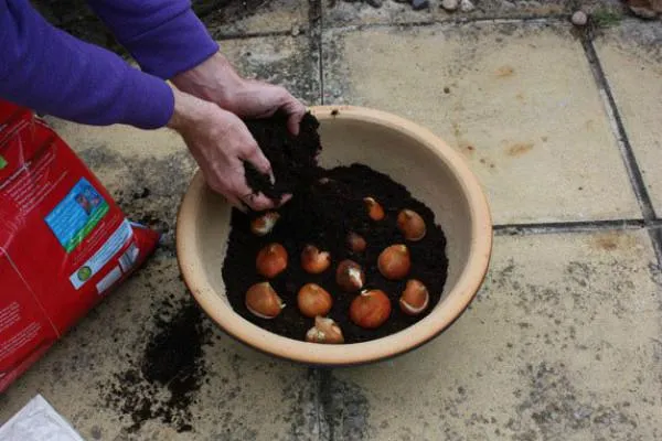 Đổ giá thể đã chuẩn bị vào chậu sao cho lớp đất cách miệng chậu khoảng 10 cm. Sau đó, đặt nhẹ nhàng củ tulip đã xử lý lạnh vào chậu, đầu nhọn hướng lên trên.