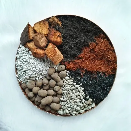 Hỗn hợp giá thể lý tưởng thường là sự phối trộn của các vật liệu như than củi, vỏ thông đã xử lý, trấu hun và một chút dăm gỗ. Tỷ lệ phối trộn nên nghiêng về các vật liệu thô. Than củi giúp kháng khuẩn và cố định cây tốt.