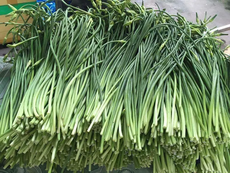 Ngồng tỏi tươi màu xanh mướt với cuống cong đặc trưng