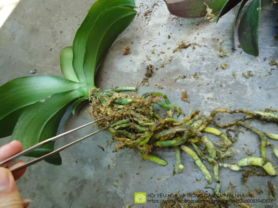Rễ khỏe có màu xanh hoặc trắng ngà, cứng cáp. Rễ hư thối có màu nâu đen, mềm nhũn, khi bóp nhẹ sẽ thấy rỗng ruột hoặc chảy dịch. Dùng kéo đã sát trùng để cắt bỏ toàn bộ phần rễ đã thối và rễ quá dài gây khó khăn khi vào chậu mới. Lan Hồ Điệp có khả năng ra rễ mới rất tốt, vì vậy đừng lo lắng khi phải cắt bỏ phần lớn bộ rễ cũ.