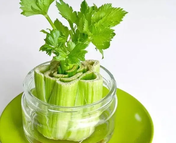 Minh họa việc đặt gốc cần tây vào nước để kích thích ra rễ