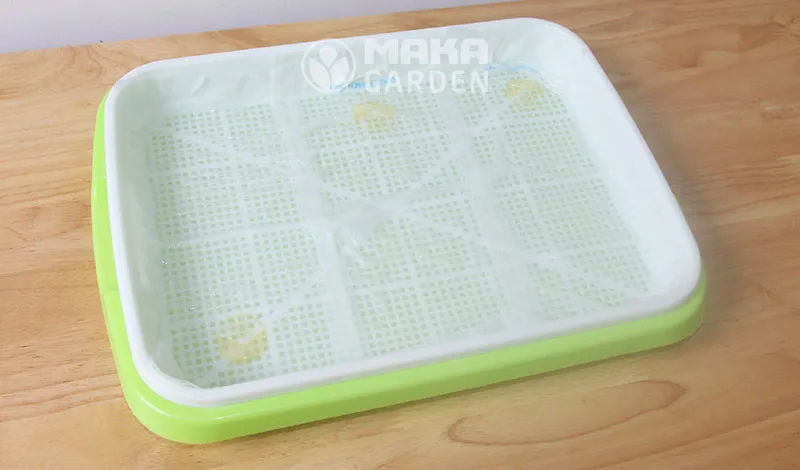 Dùng khăn giấy hoặc giấy ăn mỏng, sạch. Trải đều lớp giấy này lên mặt lưới của khay. Đảm bảo lớp khăn giấy này được làm ướt hoàn toàn bởi nước từ dưới lên. Khăn giấy giúp hạt nhỏ không bị lọt xuống dưới.