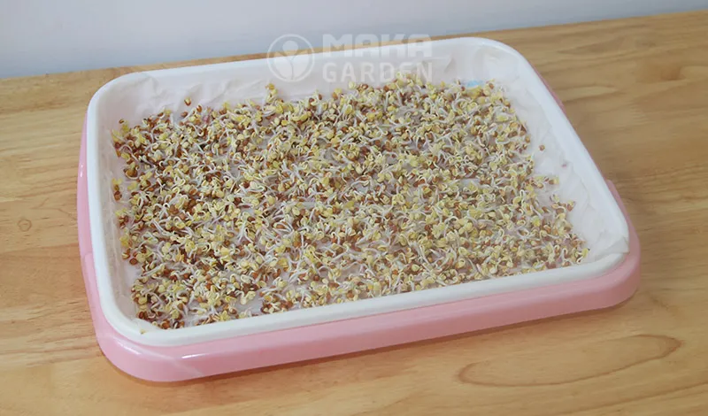 Việc rải hạt đều là bí quyết để có mẻ rau mầm đẹp. Lớp rau mầm khi thu hoạch sẽ đồng nhất. Chúng sẽ phát triển với tốc độ như nhau. Hãy rải sao cho hạt nằm sát nhau nhưng không chồng lên nhau.