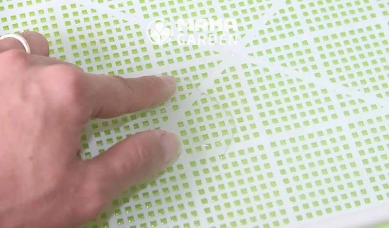 Quan trọng là không để nước đầy tràn lên mặt lưới. Điều này sẽ làm ngập úng hạt giống. Nước chỉ cần cung cấp độ ẩm cần thiết cho lớp lưới. Nước này sẽ kích thích rễ phát triển xuống.