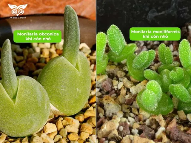 Monilaria moniliformis thường có cặp lá thứ hai dài và mảnh hơn. Nó tạo nên hình dáng tai thỏ rõ ràng. Hoa của chúng thường có màu trắng tinh khôi, tâm màu vàng nhẹ. Ngược lại, Monilaria obconica sở hữu cặp lá đầu tiên tròn trịa hơn. Cặp lá thứ hai của chúng cũng ngắn và tròn hơn so với loài kia. Cả hai loài đều mang vẻ đẹp tinh tế, thu hút bất kỳ người yêu cây nào.