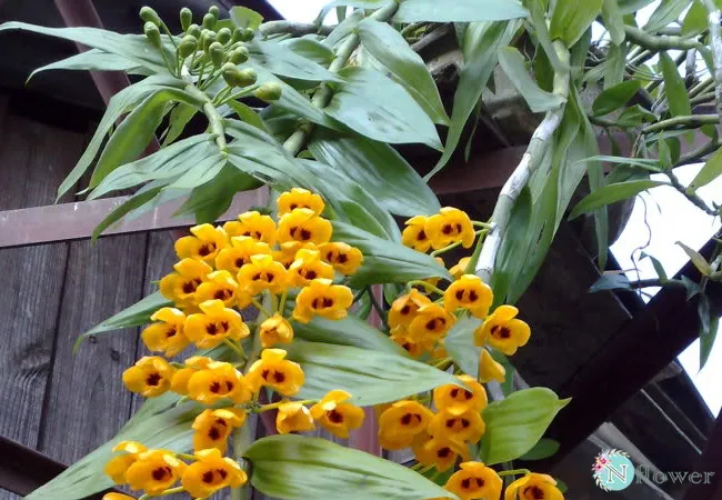 Hoa là điểm nhấn chính, mọc thành chùm rủ từ các mắt trên thân đã rụng lá hoặc thân tơ mới trưởng thành. Mỗi chùm hoa có thể mang từ 10 đến 30 bông. Hoa có màu vàng tươi hoặc vàng cam rực rỡ. Cánh hoa dày dặn, môi hoa lớn, tròn, nổi bật với các đường gân màu đỏ tía hoặc cam sẫm.