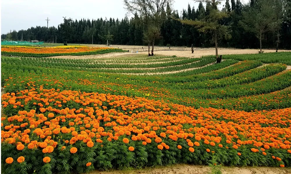 Cánh đồng vạn thọ rực rỡ trông như một bức tranh tuyệt đẹpToàn cảnh cánh đồng hoa cúc vạn thọ, nơi áp dụng triệt để cách trồng và chăm sóc hoa cúc vạn thọ theo chuẩn kỹ thuật.