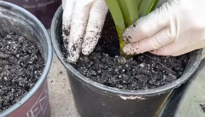 Đặt cây giống vào chính giữa chậu, giữ thân cây thẳng đứng. Sau đó, lấp đất lại xung quanh, nhẹ nhàng nén chặt gốc cây để cố định. Không nên lấp đất quá cao, giữ cho phần gốc thoáng khí.