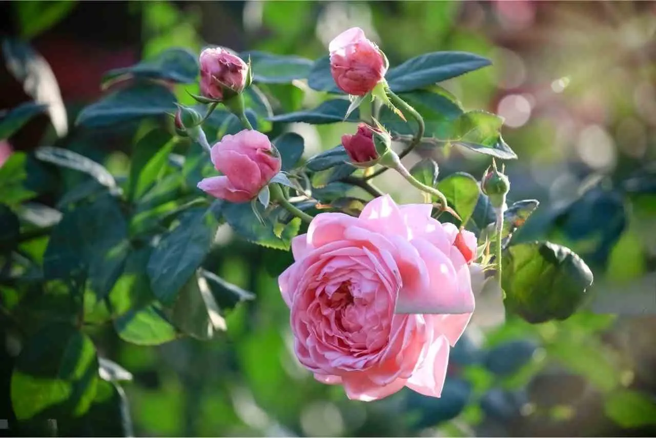 Cành hoa hồng ngoại màu hồng phấn đang nở trong vườn, với nhiều nụ non khỏe mạnh được chăm sóc đúng kỹ thuật.Cành hoa hồng ngoại màu hồng phấn đang nở trong vườn, với nhiều nụ non khỏe mạnh được chăm sóc đúng kỹ thuật.